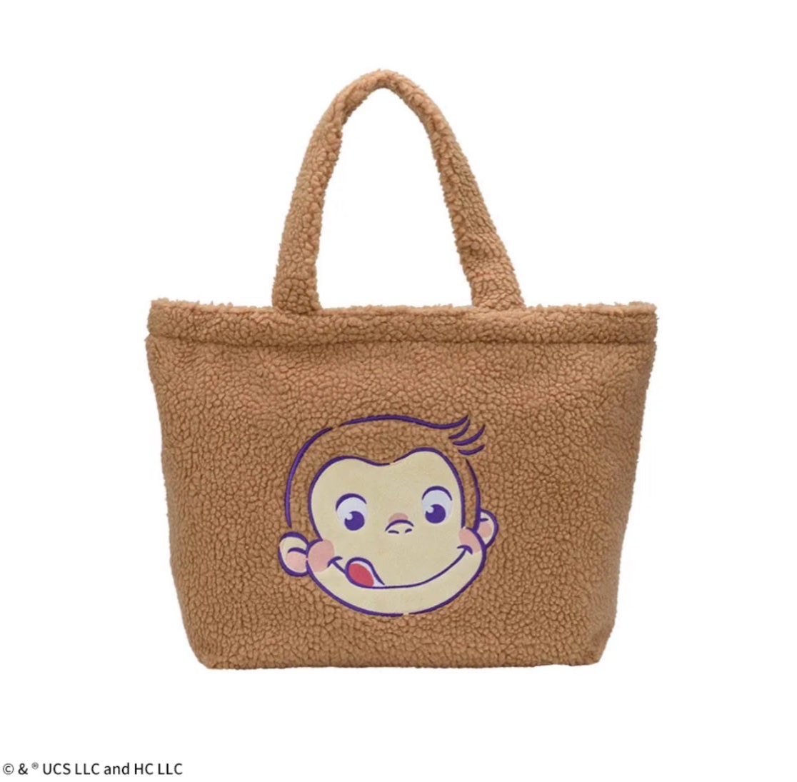 もこもこ生地の大きなサイズのバッグに「ジョージ」の顔がデザインされています。バッグの口部分にスナップボタンが付いています