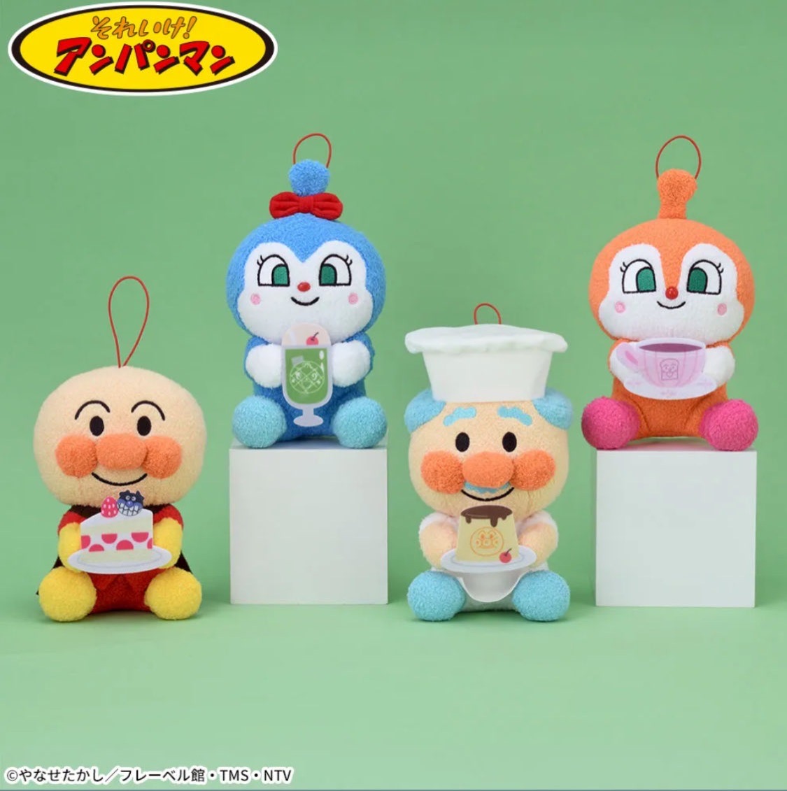 「アンパンマン」となかまたちが可愛いカフェメニューを持ったふわふわのぬいぐるみです♪