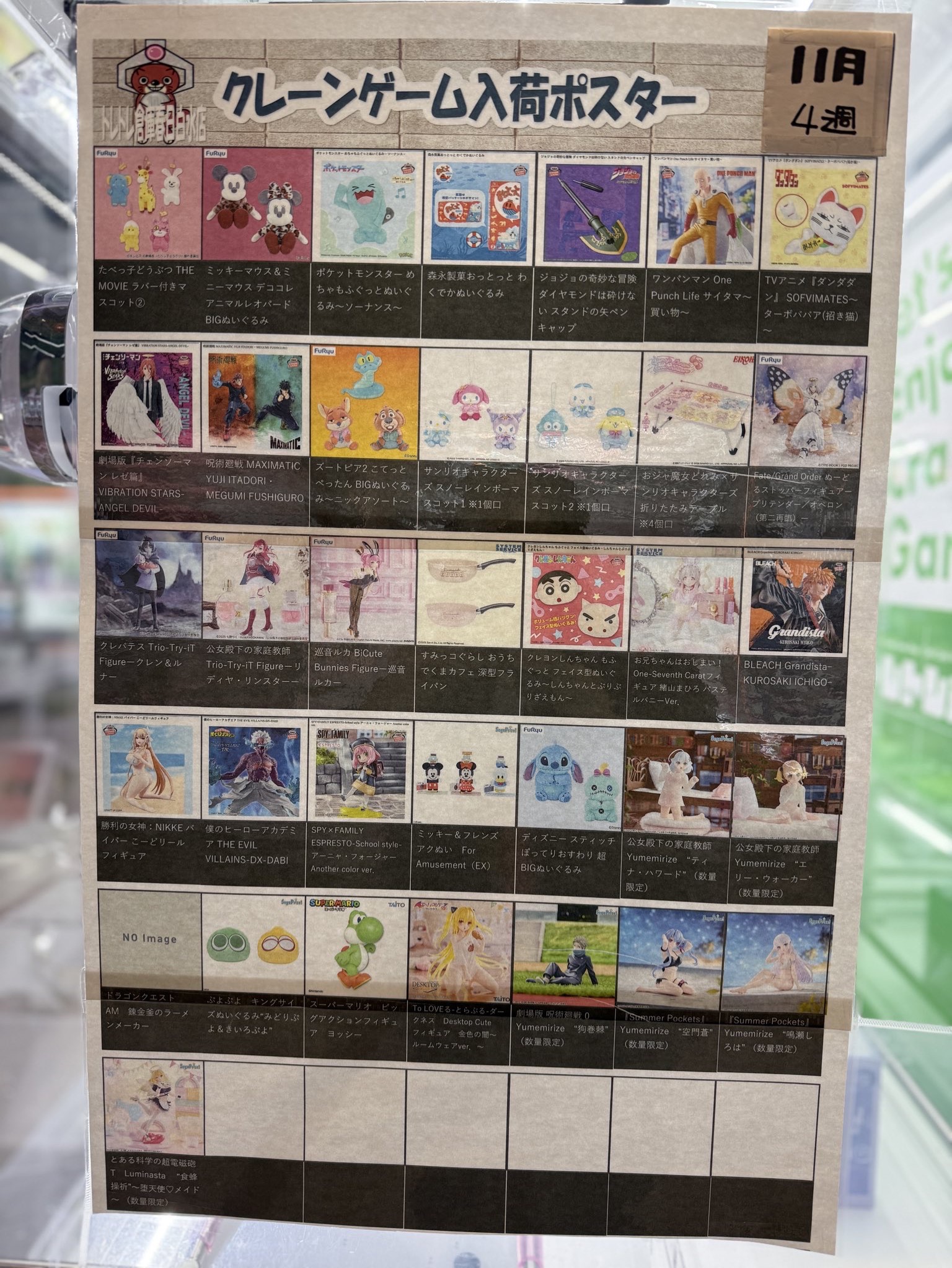 🎈今週の当店の入荷表です🦦#UFOキャッチャー #クレーンゲーム #春日市 アミューズ 2025年11月18日 🎈今週の当店の入荷表です🦦 大人気のフィギュアやかわいいぬいぐるみが沢山入荷予定です◝✩ ぜひ遊びに来てくださいね(入荷、完売情報ポストにはタイムラグがありますご了承ください) 確実な在庫状況をお知りになりたい場合は恐れ入りますが、お電話にてお問い合わせください 【↓混み合っている場合繋がりにくい事もあります】 📲092-558-9700 各SNSはバナーをタップ!