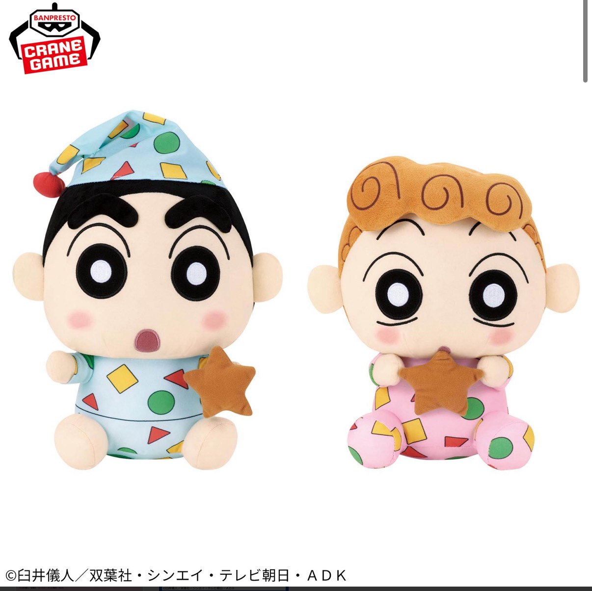 バンプレストオリジナルテーマ「みんなでパジャマパーティだゾ!」デザインのしんちゃんとひまわりのぬいぐるみです。おなじみのパジャマ柄をあしらったデザインです!
