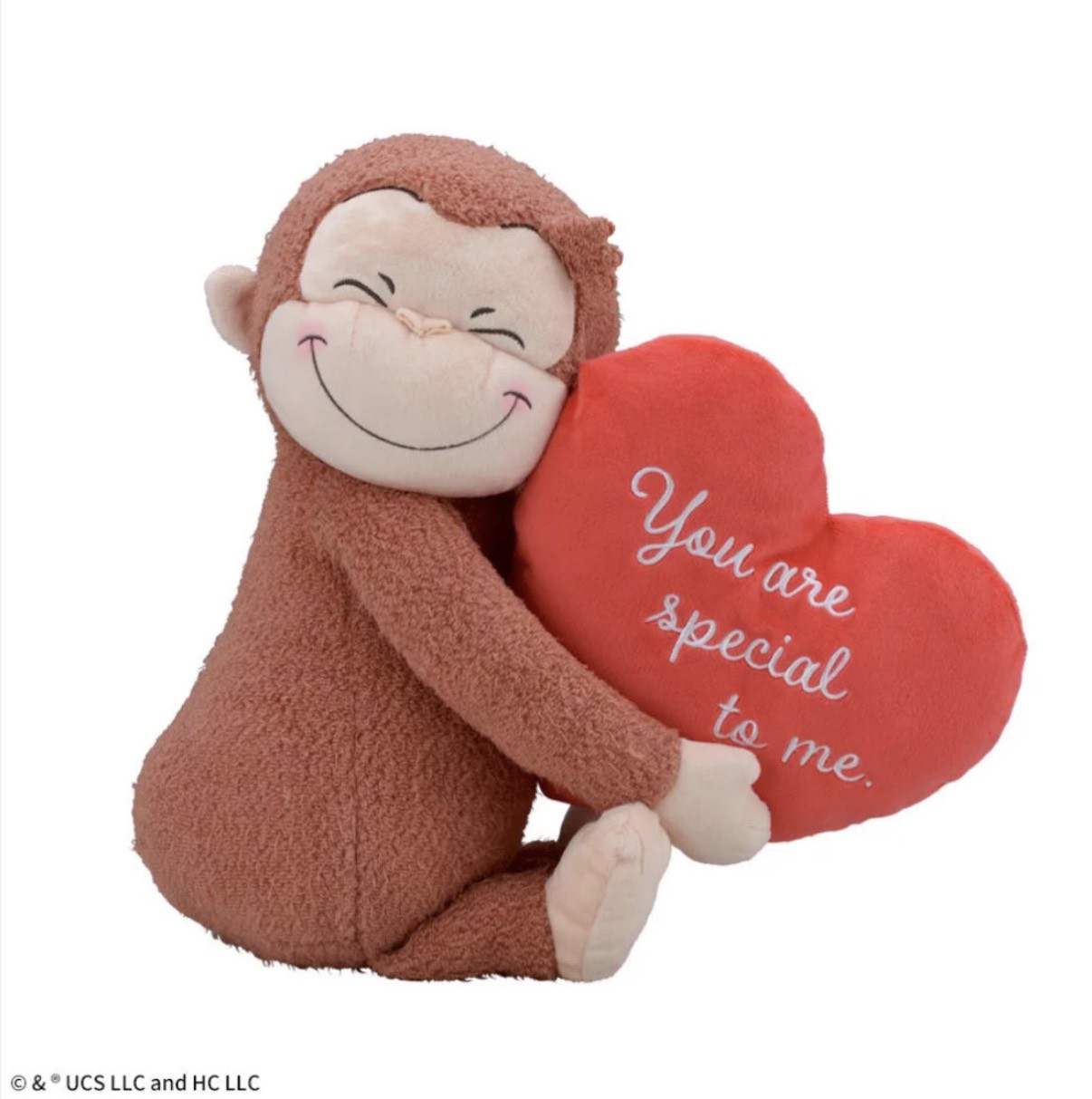 「おさるのジョージ」85周年を記念したデザインの大きなぬいぐるみです!大きなハートをハグした「ジョージ」がとってもキュート!