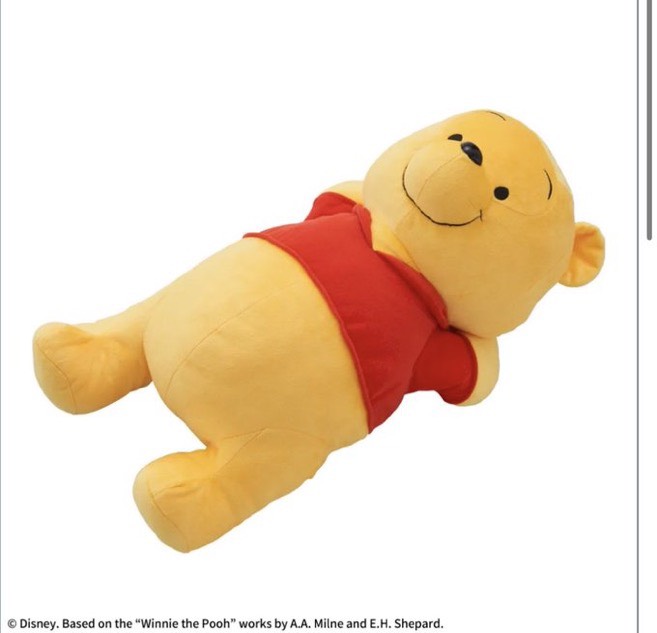 ‎仰向けでのんびり寝ている「プー」の大きなぬいぐるみです。